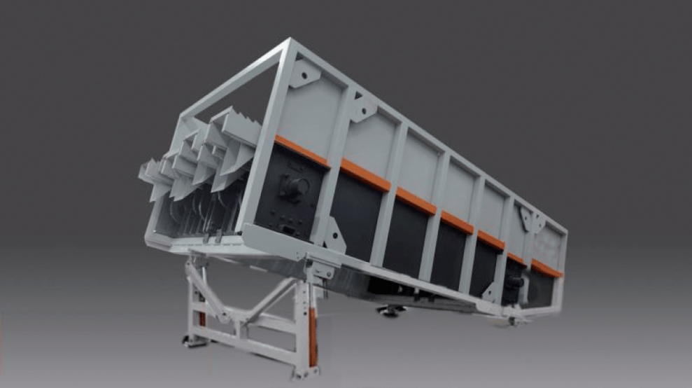 彈跳分選篩在驅(qū)動電機的作用下,通過主動軸、被動軸、偏心輪(曲軸、鏈條等傳動裝置)組成的主被動傳動機構(gòu)與支撐座和篩板連接形成平行四桿機構(gòu),篩板產(chǎn)生類似于彈跳的往復圓周運動,將從進料口輸入的物料分離為三種,粒徑大反跳效果好的、沉重的、能滾動的3D物料,粒徑小、反彈效果差的篩下物料,粒徑大反彈效果差的、扁平的、輕質(zhì)的2D物料,分別被三個出料斗接收。
