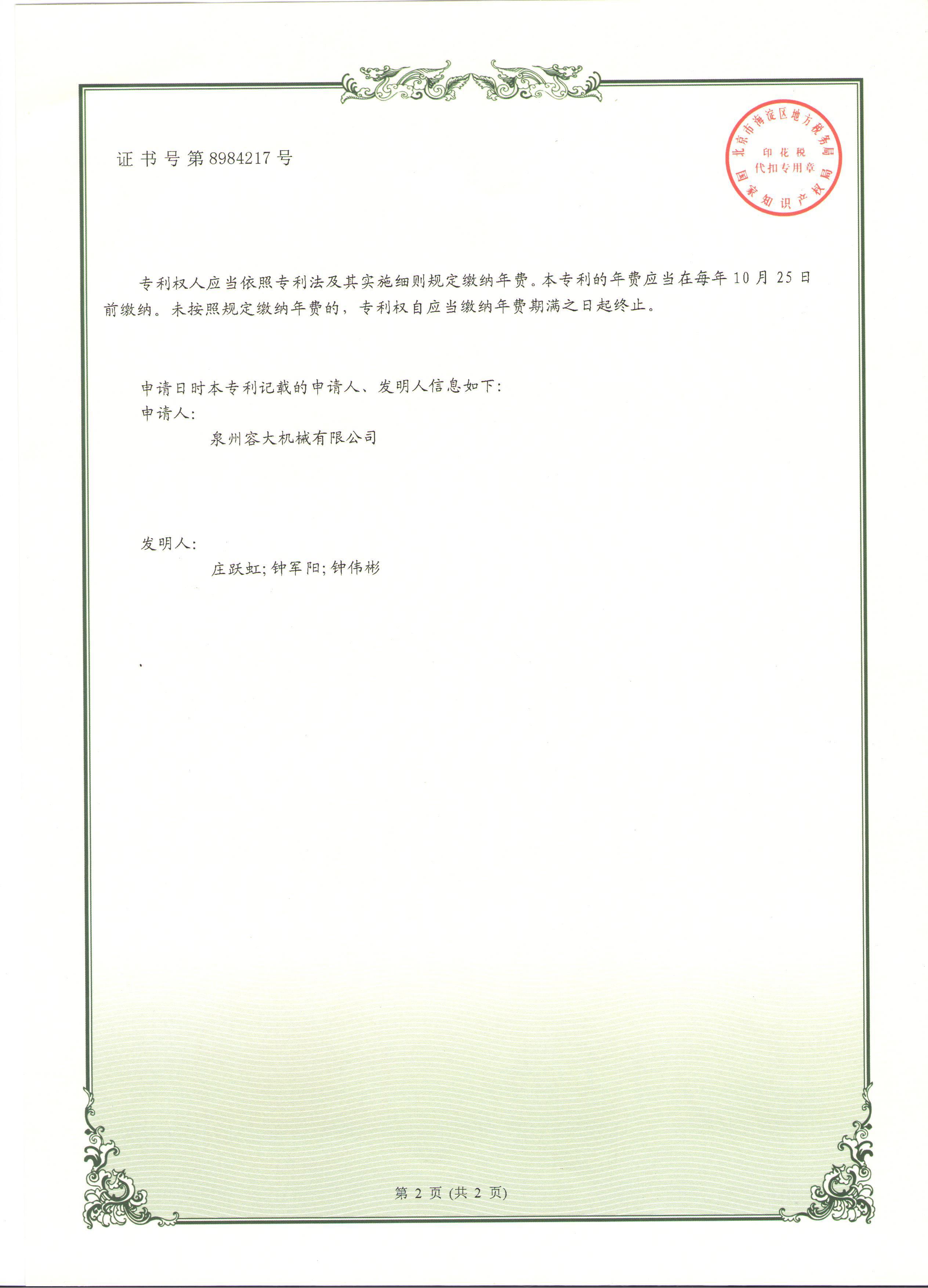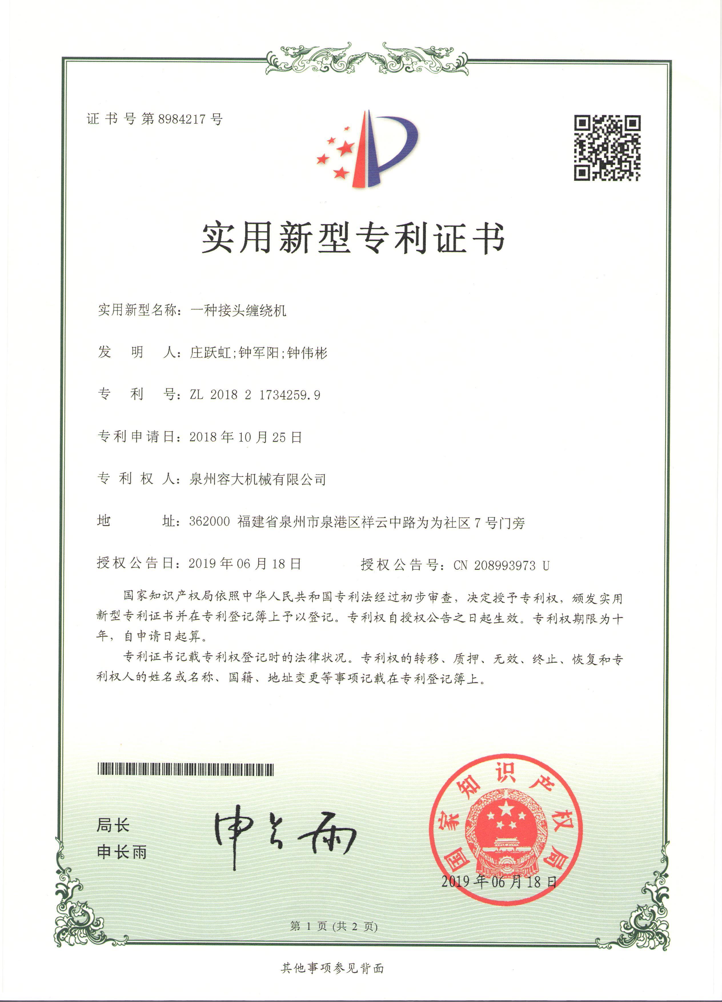您的位置: 泉州容大機(jī)械有限公司 > 專利證書 > 接頭纏繞機(jī)